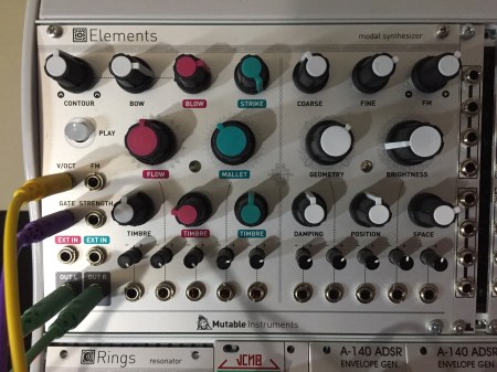 Braids and Tip Top Z4000: Modulation on timbre to get a distinctive range of articulations. Trigger from Branches goes to Tip Top Z4000 ADSR, which in turn goes to VCA.