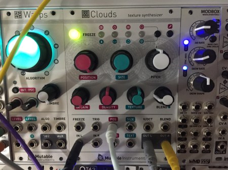 Clouds is set to capture 16 seconds of input. The phrase doesn’t sound as long because it’s played back faster via the POS cv input. The result was entirely serendipitous – what you hear is quite different (and more mysterious) than what I put in :).